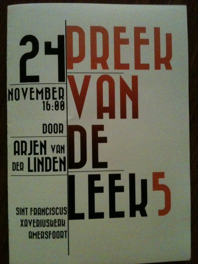 Uitgenodigd door de organisatie van de Preek van de Leek, mocht ik op deze zondagmiddag 24 november in de door mijzelf gecomponeerde dienst voorgaan, als lekenpreker. Gehouden aan de opbouw van de liturgie bracht ik gedichten, onder andere Prego (voor mijn vader), De Verkering (Ode op Amersfoort) en het speciaal voor deze gelegenheid geschreven Op zoek. Mijn Preek ging over de Talenten. De zoektocht naar je talent, maar ook dat je voor echt succes ook durf en doorzettingsvermogen nodig hebt. Benut je talent is mijn boodschap en blijf niet doen wat je deed als je daar niet gelukkiger van gaat worden! De dienst werd opgeluisterd door mijn band Coverstory en we speelden onder andere Windows of Hope, Unchain my heart en You´ve got a friend. Precies zoals ik het heb gewild, werd het een swingende soulvolle dienst. Helaas is het maar eenmalig, voor mij dan.....